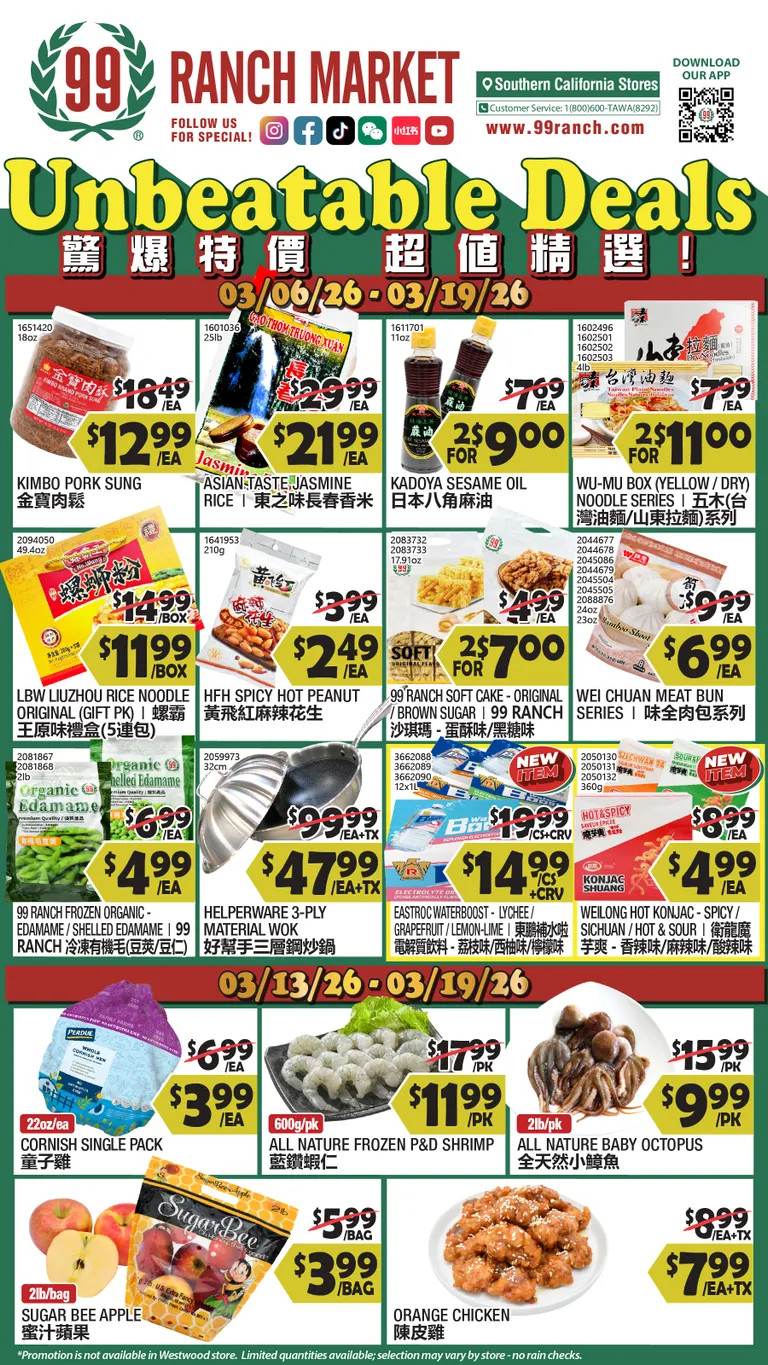 You’re viewing the 99 Ranch Market weekly ad, valid from 03/06/2026 to 03/19/2026. Visit our website regularly to stay up to date with the latest deals and promotions from your favorite stores.